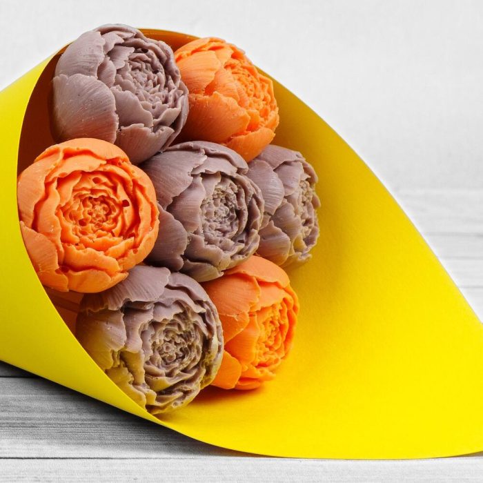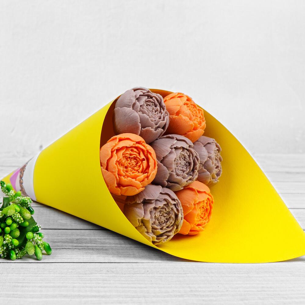 Букет из шоколадных пионов оранжево-сиреневый в дизайнерском желтом картоне