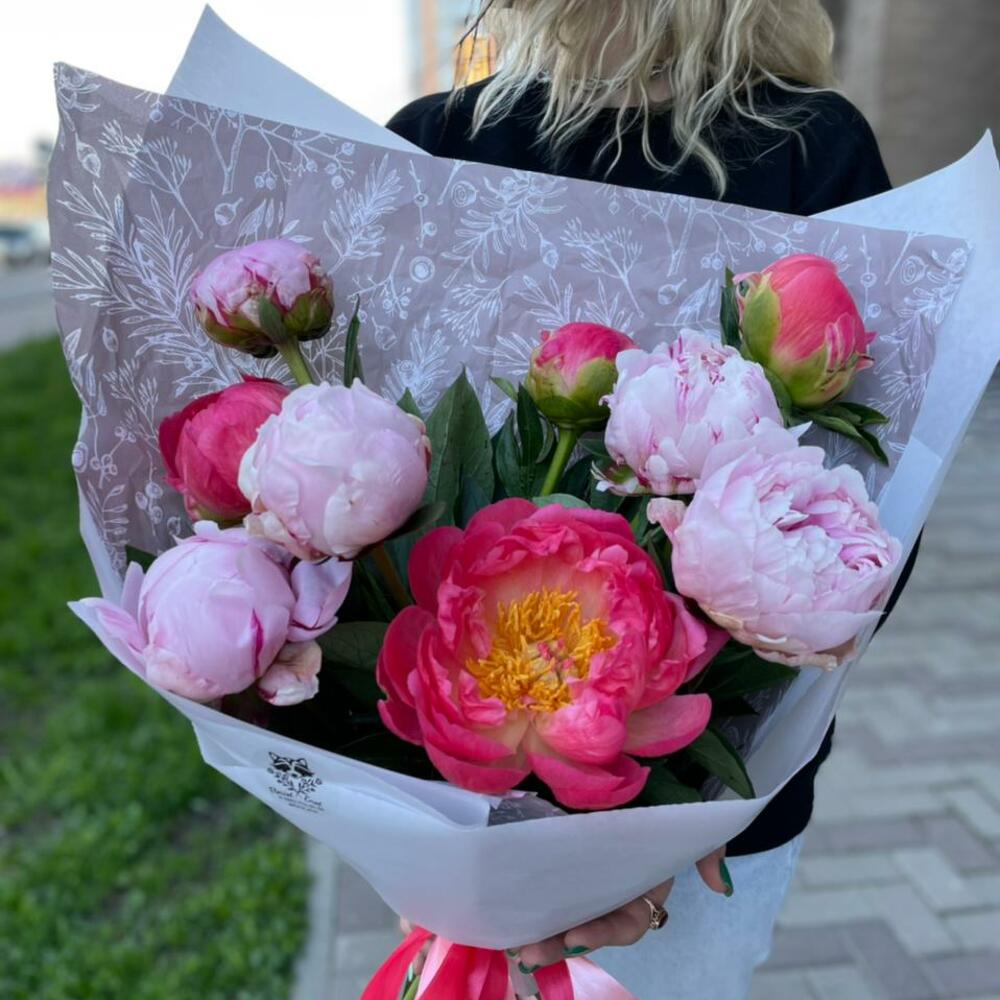 Лента атласная – 1 шт.Тишью – 1 шт.Пион премиум – 9 шт.Матовая упаковка – 1 шт.