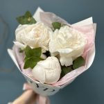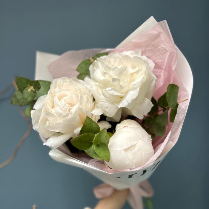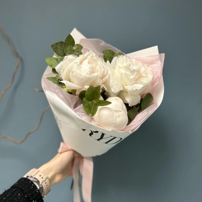 Эвкалипт – 1 шт.Тишью – 1 шт.Упаковка дизайнерская – 1 шт.пион mother’s choices – 3 шт.