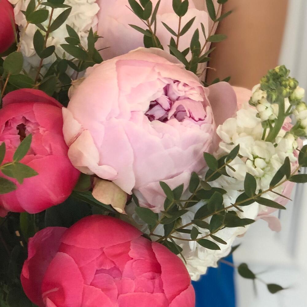 пионы sara bernhardt – 4 шт.пионы coral charm – 3 шт.Маттиола – 5 шт.эвкалипт parvifolia – 2 шт.Фисташка – 2 шт.Лента репсовая – 1 шт.Средство для продления жизни цветов – 1 шт.
