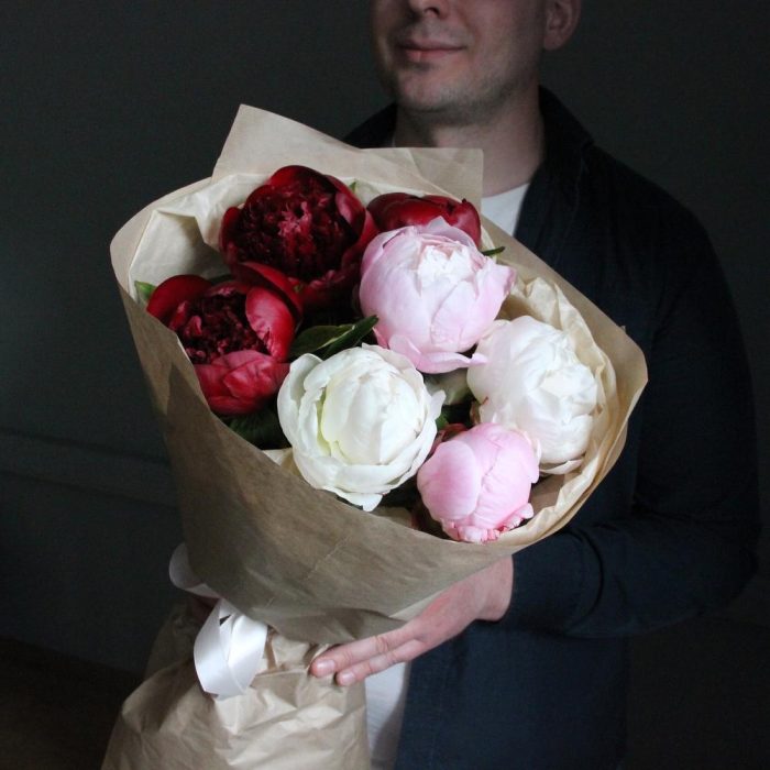 Букет из бордовых, розовых и белых французских пионов в лаконичной упаковке.Стильное цветочное решение для любого случая.