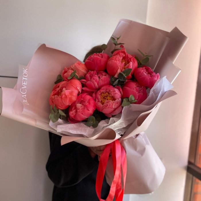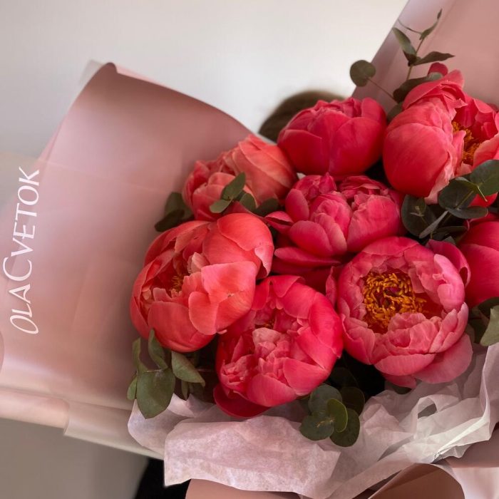 пионы Коралл шарм – 9 шт.Эвкалипт – 6 шт.Пленка дизайнерская – 5 шт.Лента атласная – 2 шт.Тишью белое – 2 шт.инструкция по уходу за цветами – 1 шт.Кризал (подкормка) – 1 шт.