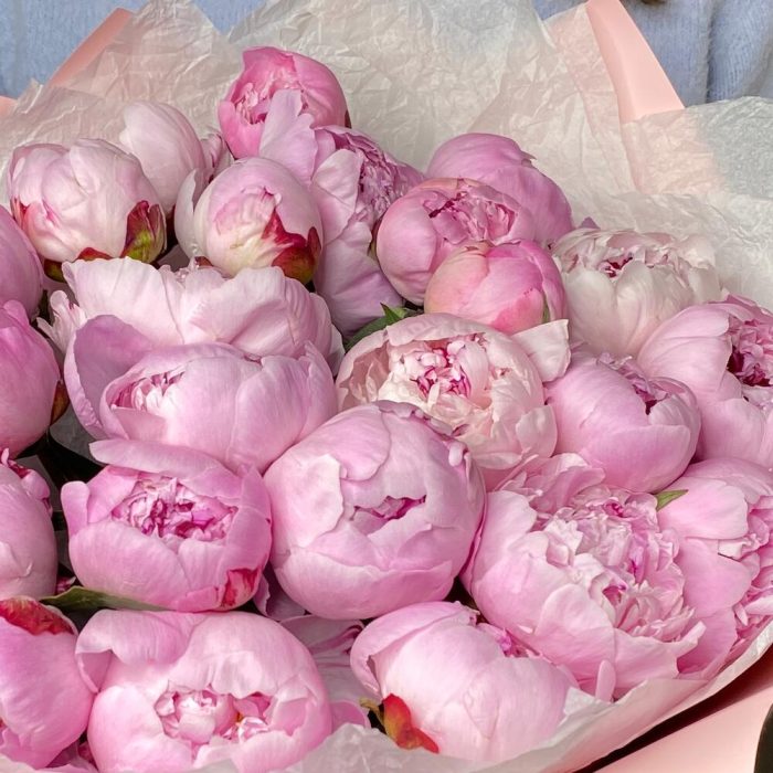 Лента атласная – 1 шт.Пион Сара Бернар – 25 шт.Упаковка дизайнерская – 10 шт.