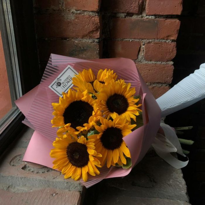 Букет из 5 подсолнухов в стильной упаковке “Солнечные блики”