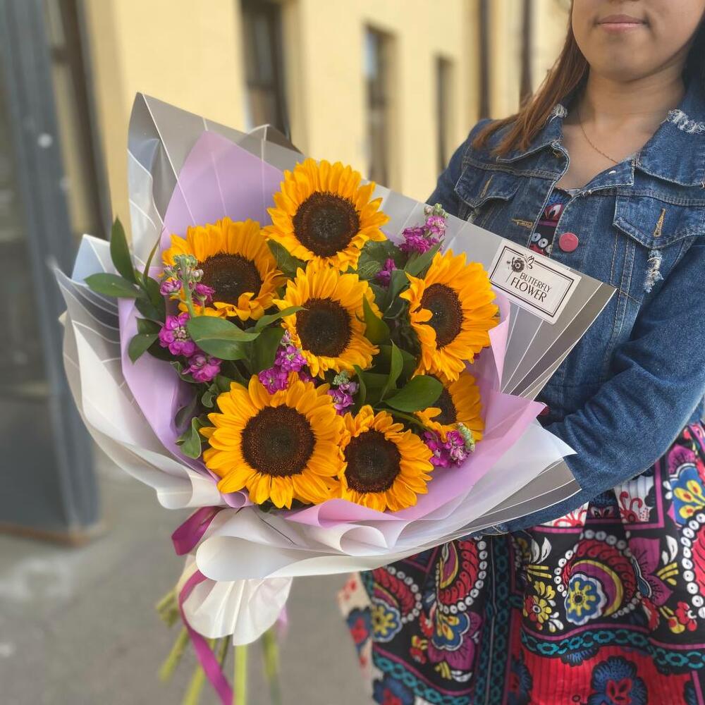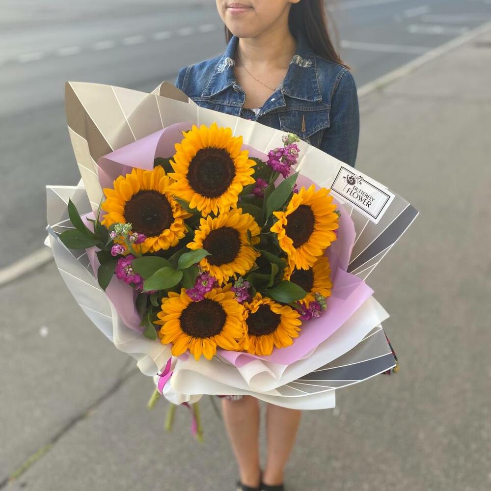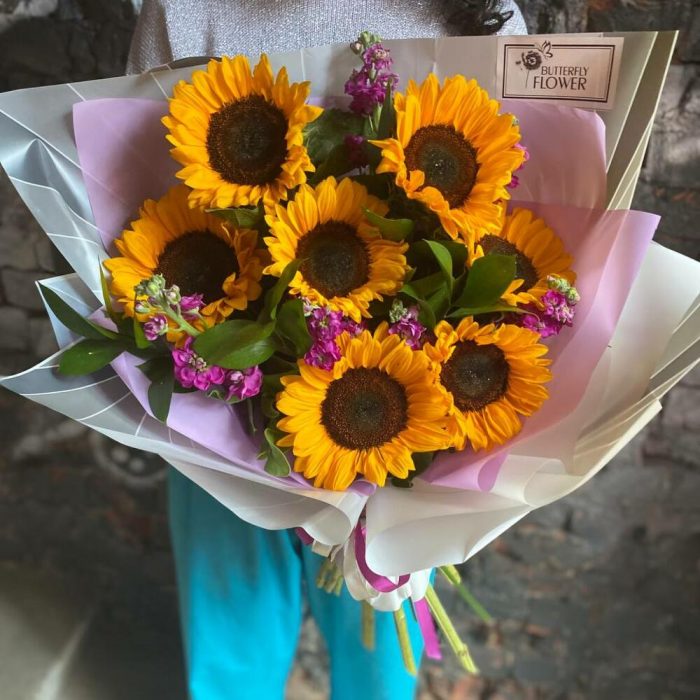Маттиола – 6 шт.Рускус – 5 шт.Упаковка – 2 шт.Подсолнух – 7 шт.