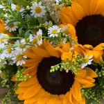 Букет подсолнухов с ромашками ( матрекарией), гипсофилой, тиласпией и зеленью