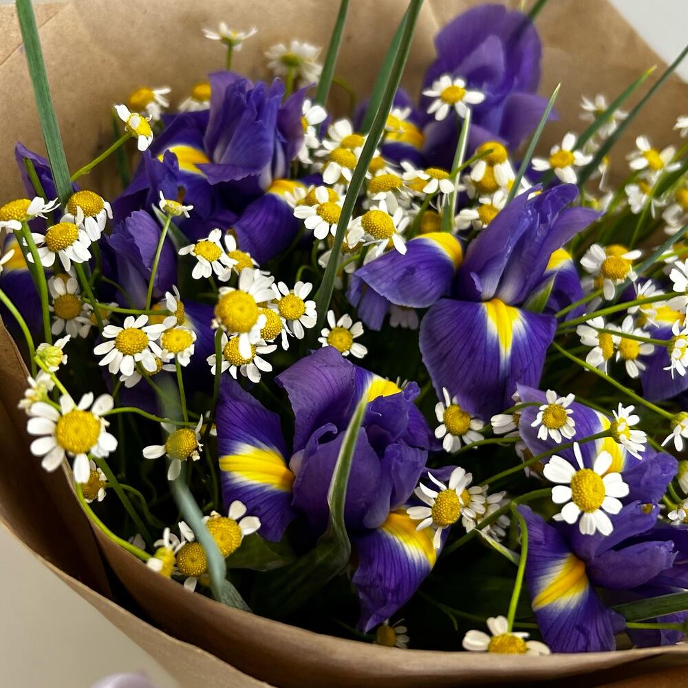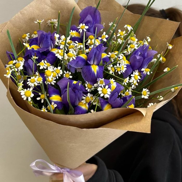 Ирис – 7 шт.Ромашка кустовая – 6 шт.Зелень – 2 шт.Упаковка дизайнерская – 2 шт.