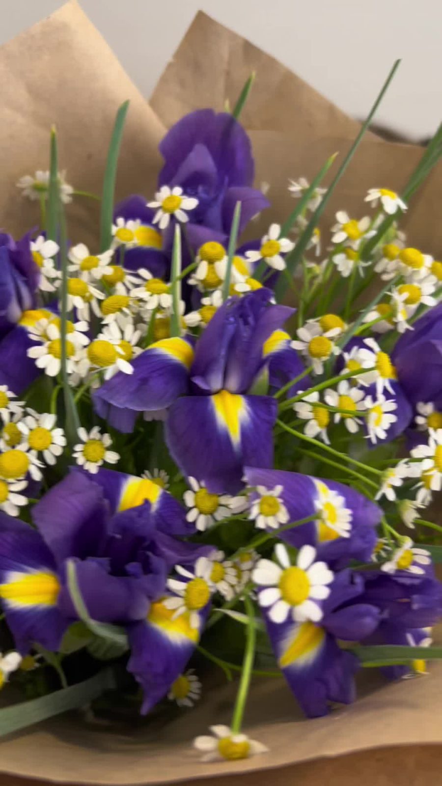 Букет из нежной ромашки и ярких фиолетовых ирисов