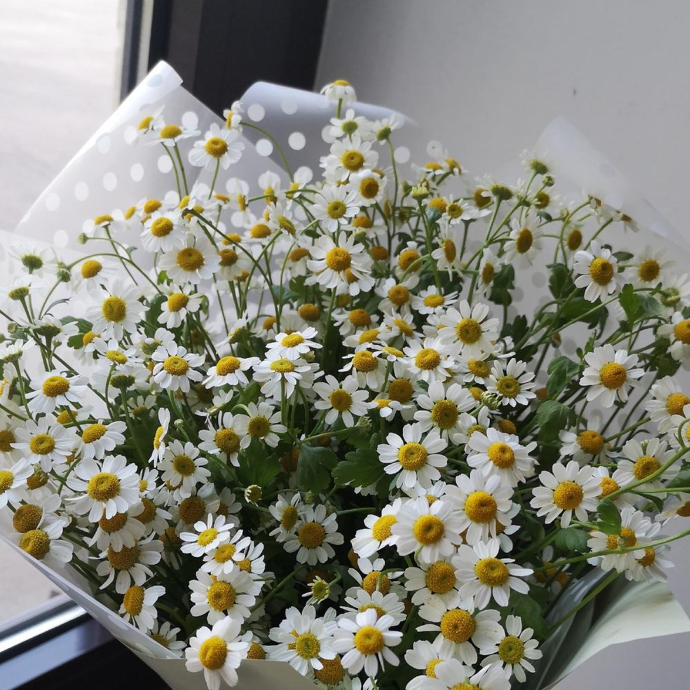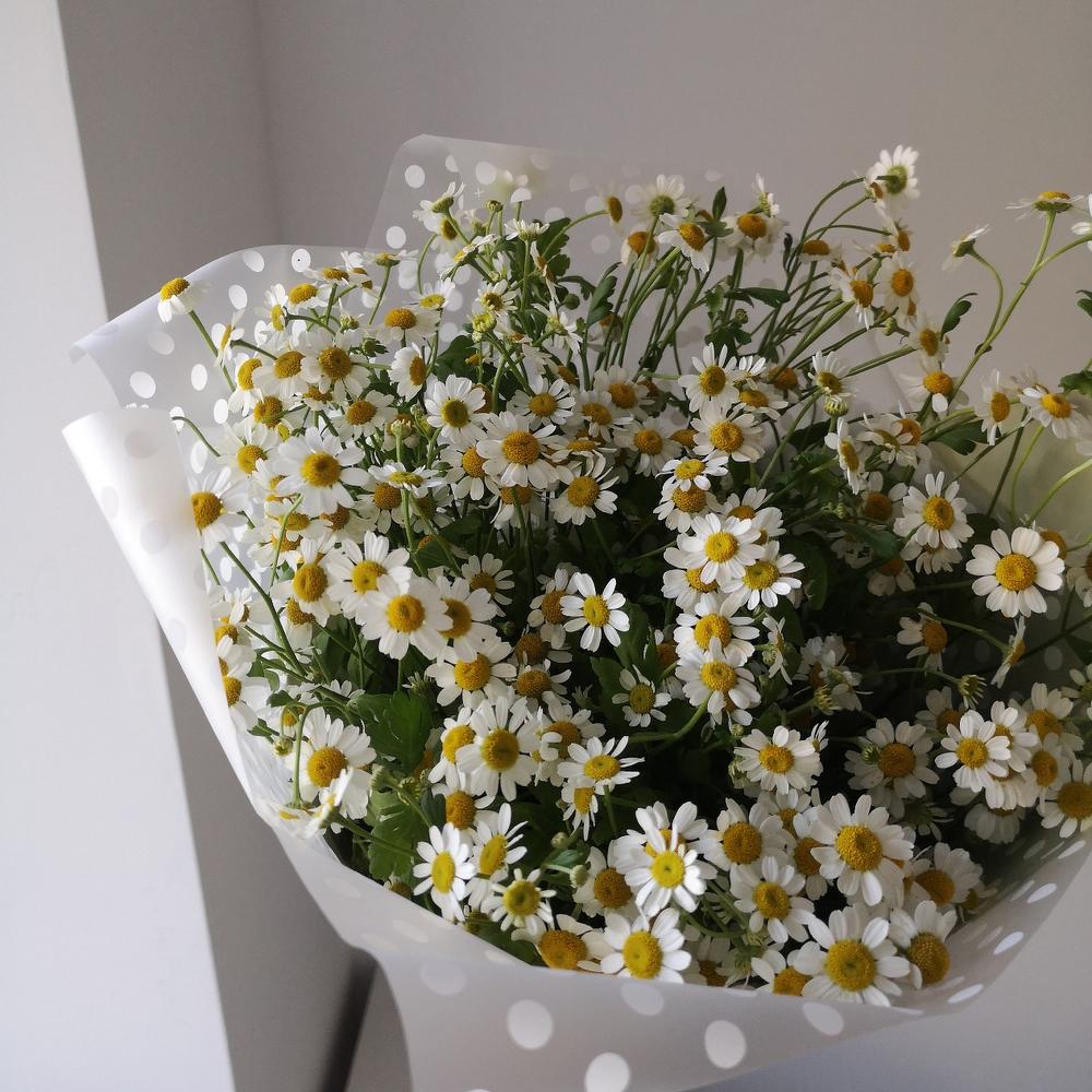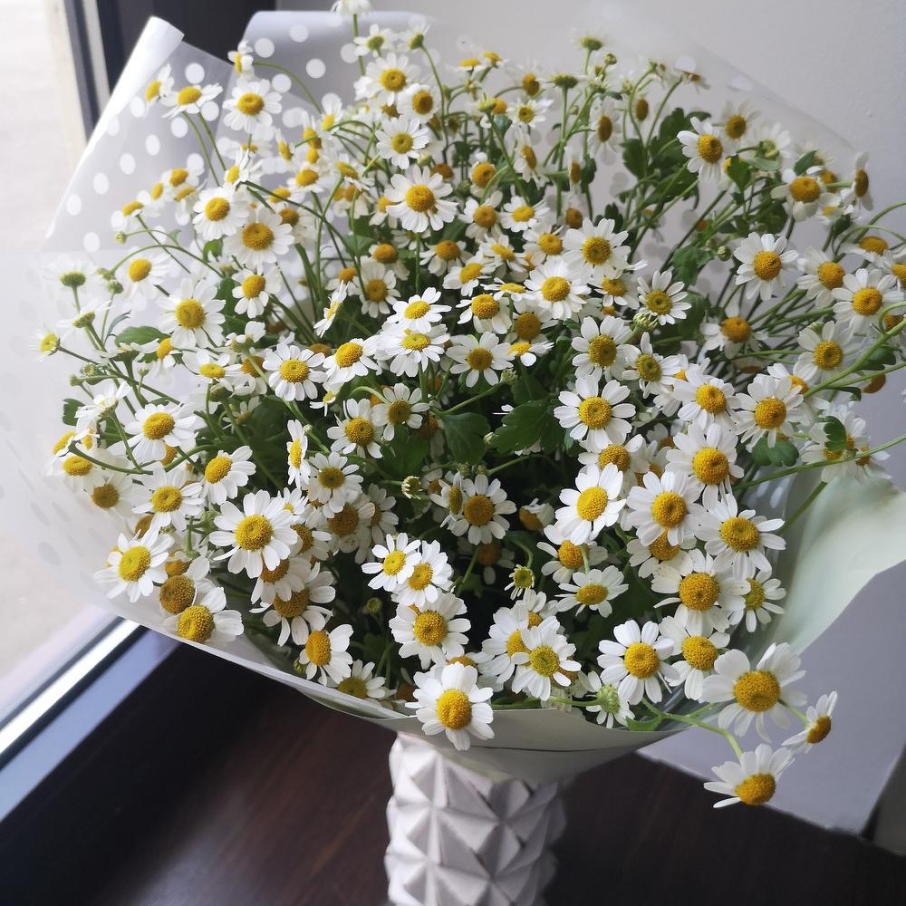 Матрикария (Ромашка Камила) – 15 шт.Упаковка дизайнерская – 2 шт.Лента атласная – 1 шт.