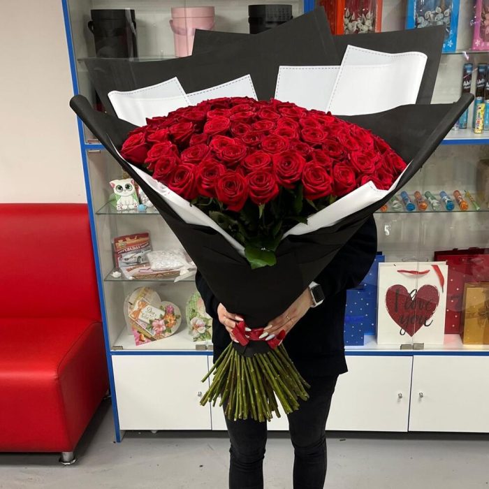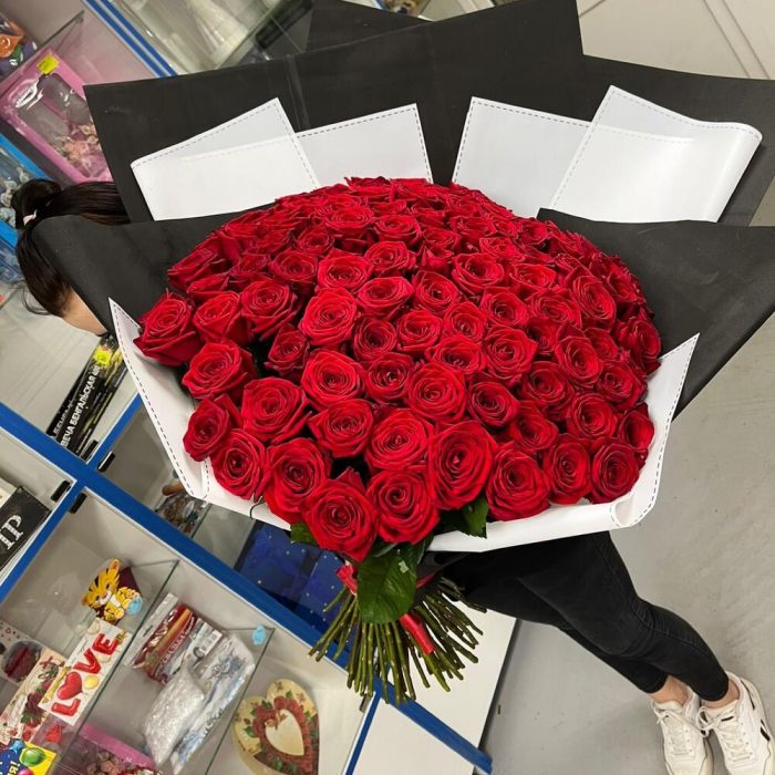 розы элигантные ароматные – 101 шт.Упаковка дизайнерская – 2 шт.Лента атласная – 1 шт.