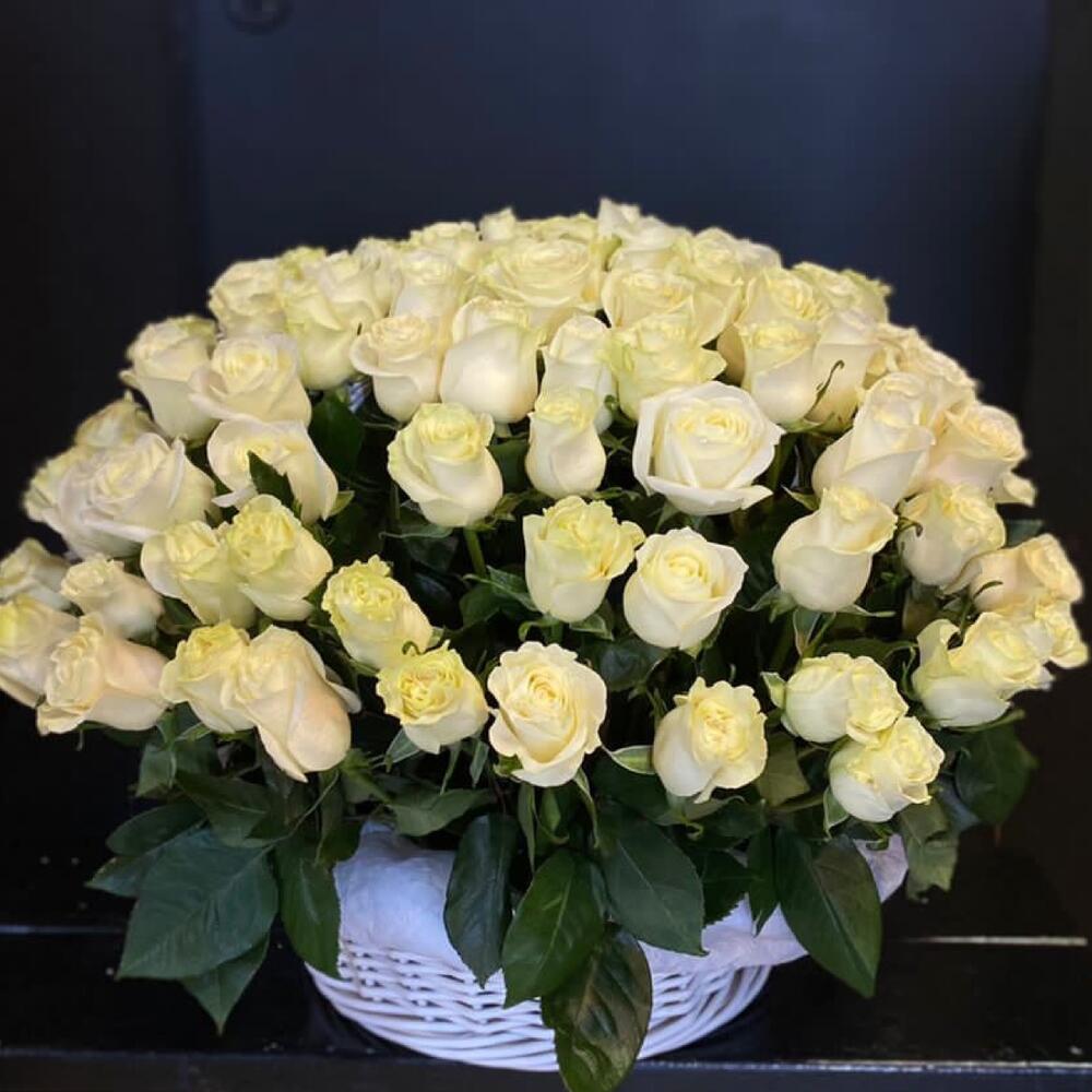 Метки: 101 роза, от 5000 руб, цветы в корзине