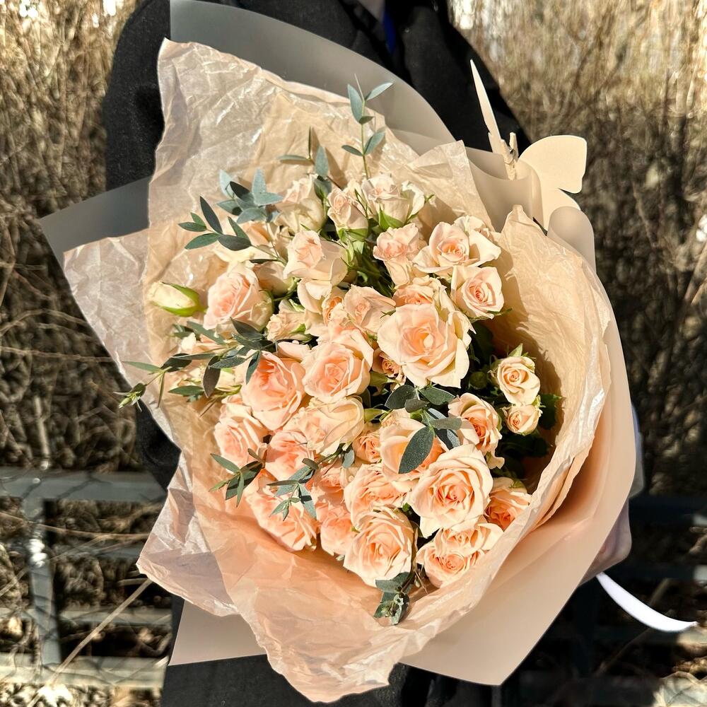 Роза кустовая – 11 шт.Эвкалипт – 3 шт.Лента атласная – 1 шт.Пленка матовая – 2 шт.Открыточка с вашими пожеланиями – 1 шт.тишью персиковое – 2 шт.
