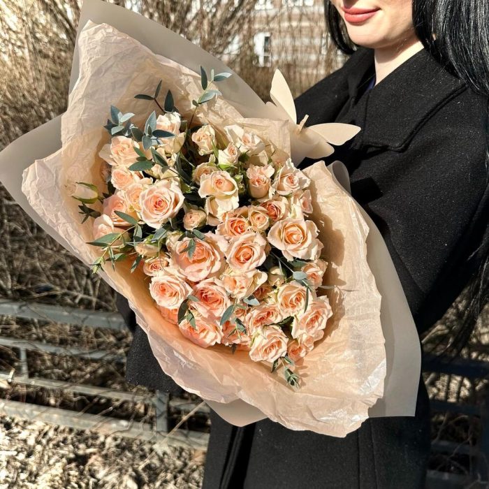 11 персиковых кустовых роз с эвкалиптом