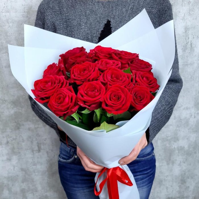 Лента – 1 шт.Упаковка – 1 шт.Роза красная 60 см – 15 шт.