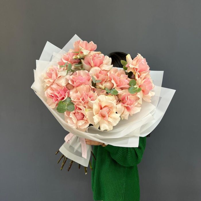 15 нежно-розовых французских роз с эвкалиптом
