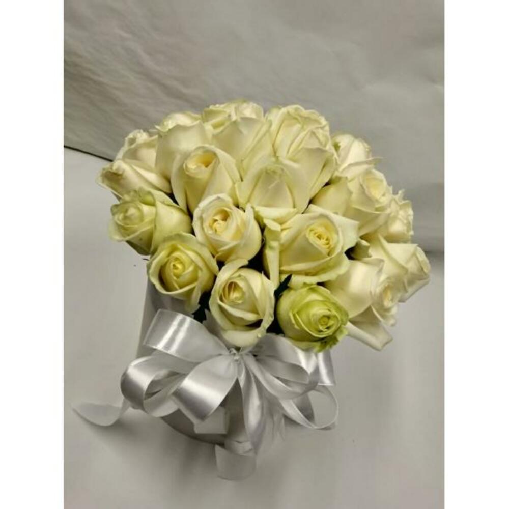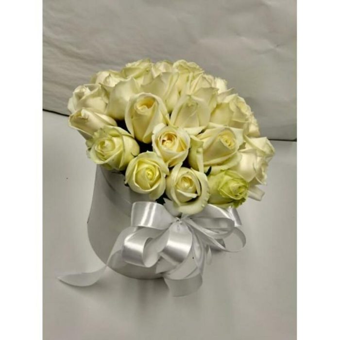 25 белых роз Аваланш в шляпной коробке