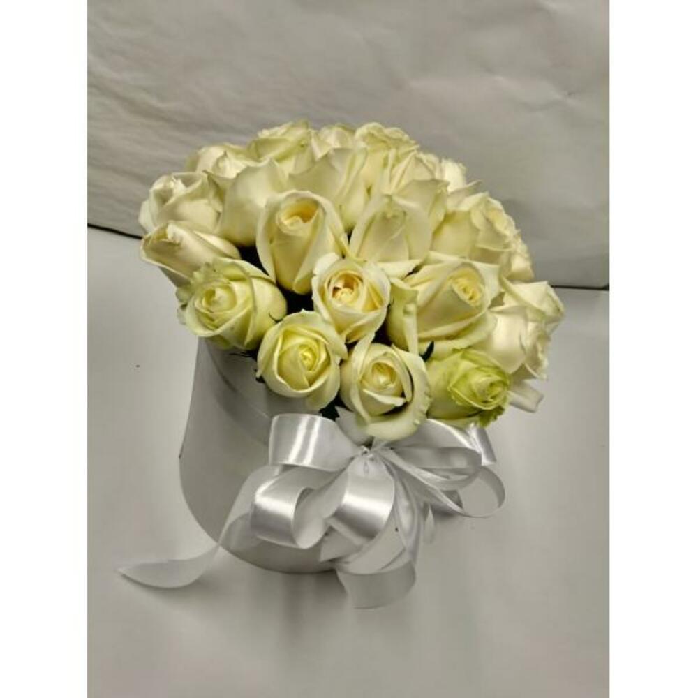 розы – 25 шт.Шляпная коробка – 1 шт.доставка – 3 шт.