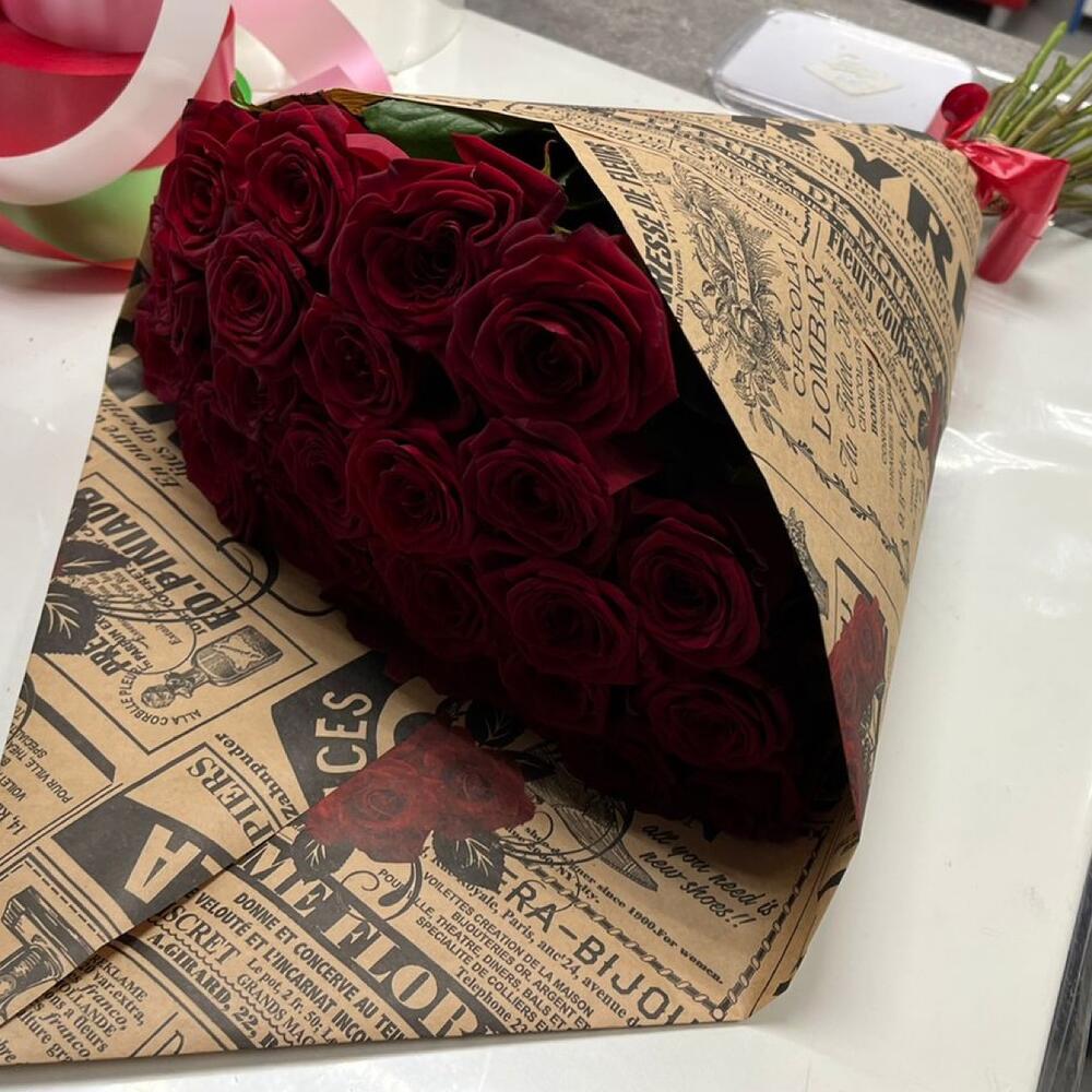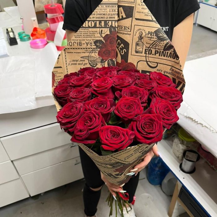 розы эквадор 70 см – 25 шт.стильный крафт – 2 шт.Атласная лента – 1 шт.