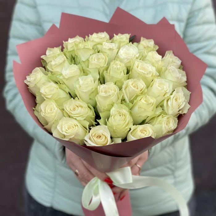 Букет из 31 белой розы Аваланч – это беспроигрышный вариант, такой букет не оставит равнодушной ни одну девушку.