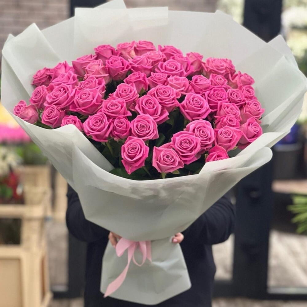Лента – 1 шт. Розовая роза – 51 шт. Современная упаковка – 1 шт.
