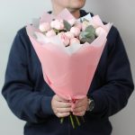 Эвкалипт – 4 шт.Лента атласная – 1 шт.Упаковка дизайнерская – 4 шт.роза кустовая пионовидная мэнсфилд парк – 7 шт.