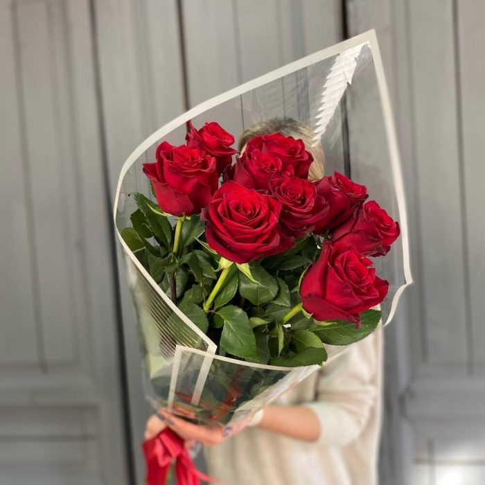 Роза Эквадор – 9 шт.Упаковка дизайнерская – 1 шт.Лента атласная – 1 шт.
