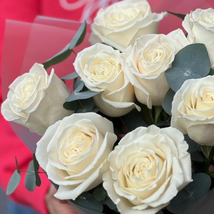 Эвкалипт – 1 шт.Упаковка дизайнерская – 1 шт.роза плая бланка премиум 70 см – 11 шт.