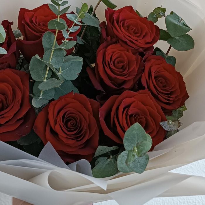 роза эквадор 70 см красная – 9 шт. Эвкалипт Микс – 3 шт. Упаковка дизайнерская – 1 шт.