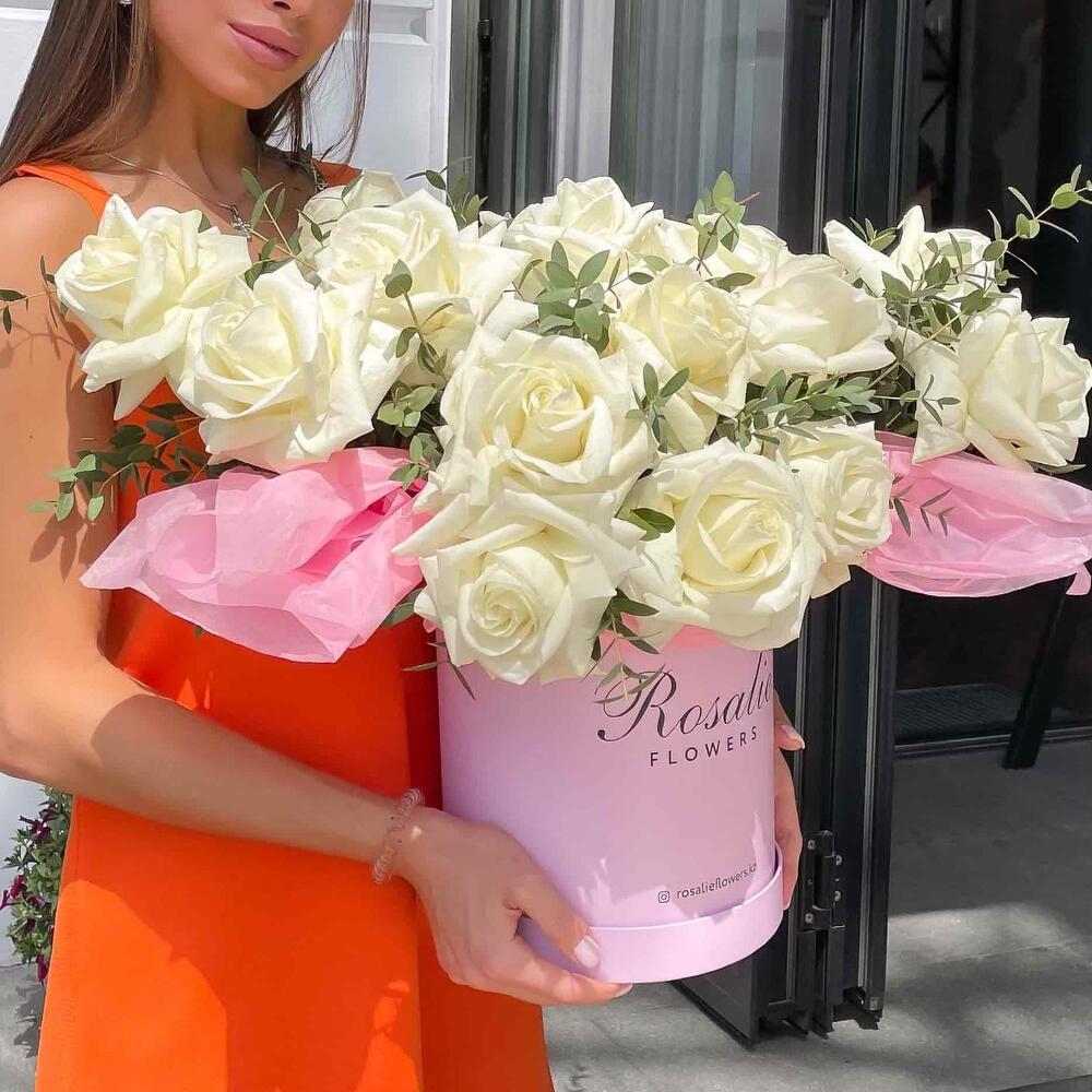Роза 40 см – 21 шт. Эвкалипт – 1 шт. коробка фирменная – 1 шт.