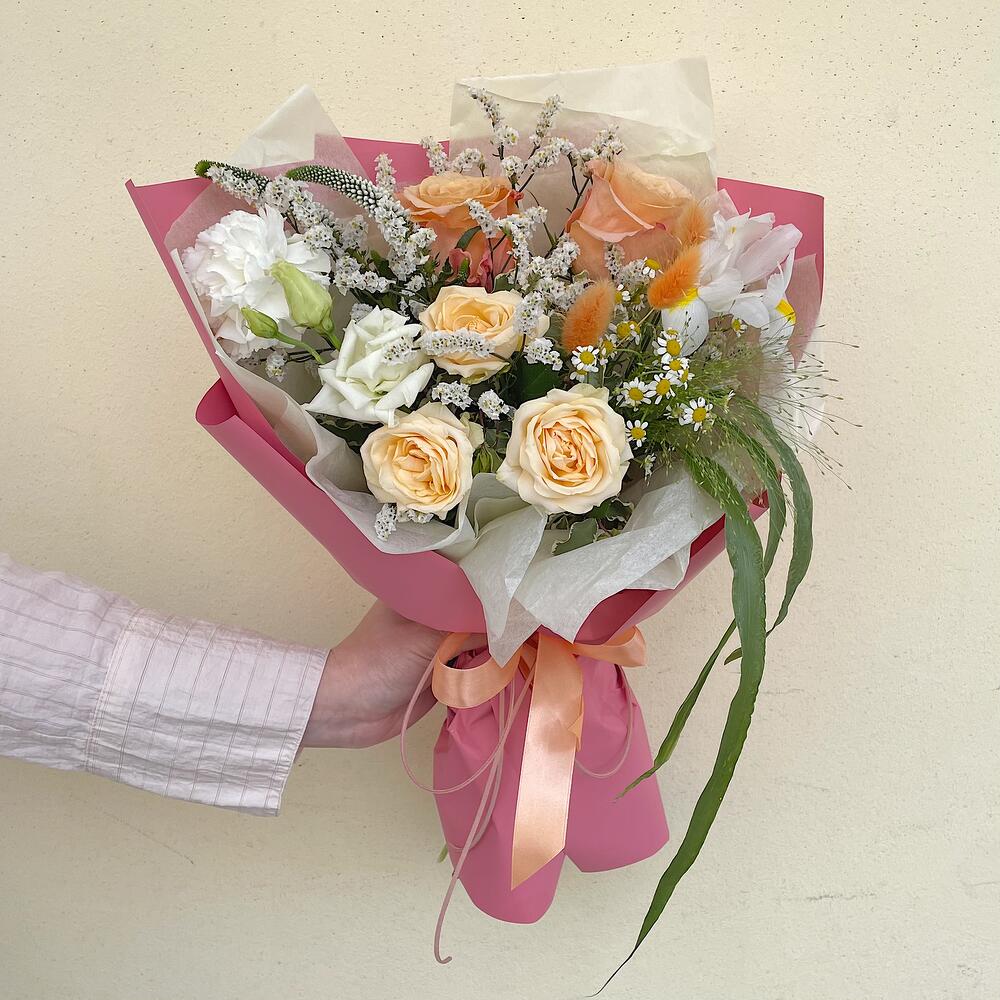 Роза шиммер – 2 шт.Роза кустовая – 1 шт.Ирис – 1 шт.Лимониум – 1 шт.Танацетум – 1 шт.Диантус – 1 шт.Питтоспорум – 1 шт.Лагурус – 3 шт.Упаковка дизайнерская – 1 шт.