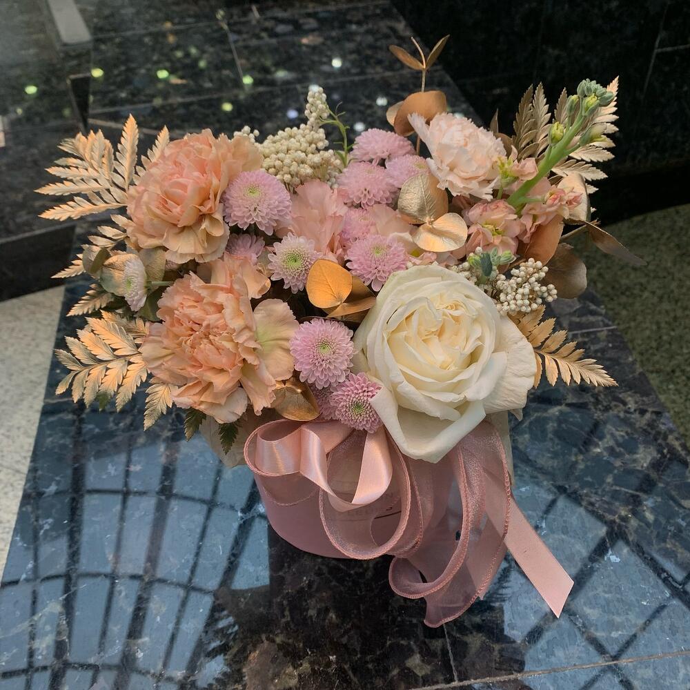 Композиция из французских роз в шляпной коробке