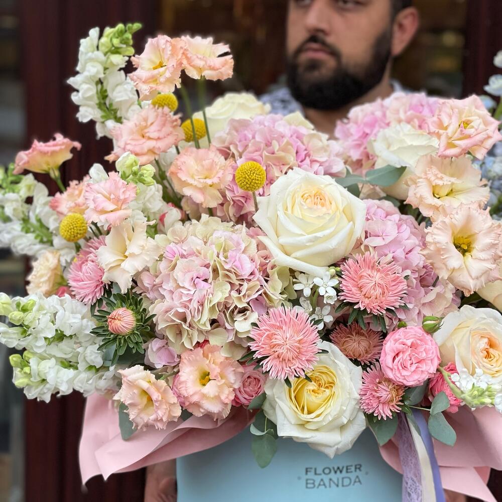 Гортензия розовая – 7 шт.Роза эквадор 50 см – 9 шт.Дельфиниум голубой – 7 шт.антиринум – 10 шт.Астра – 5 шт.Лизиантус – 10 шт.Роза бомбастик кустовая – 7 шт.Краспедия желтая – 7 шт.Коробка шляпная большая – 1 шт.эвкалипт синерея – 1 шт.