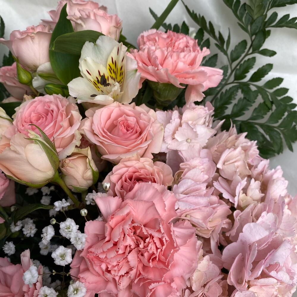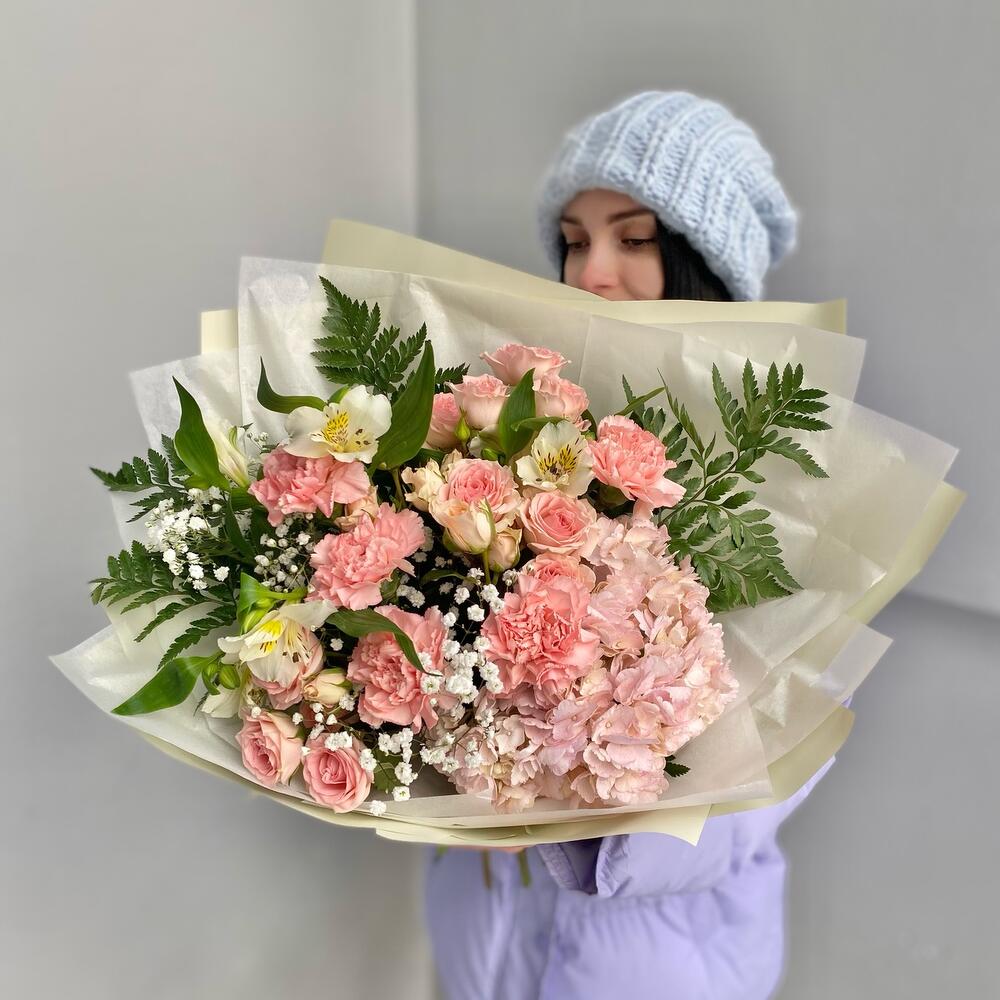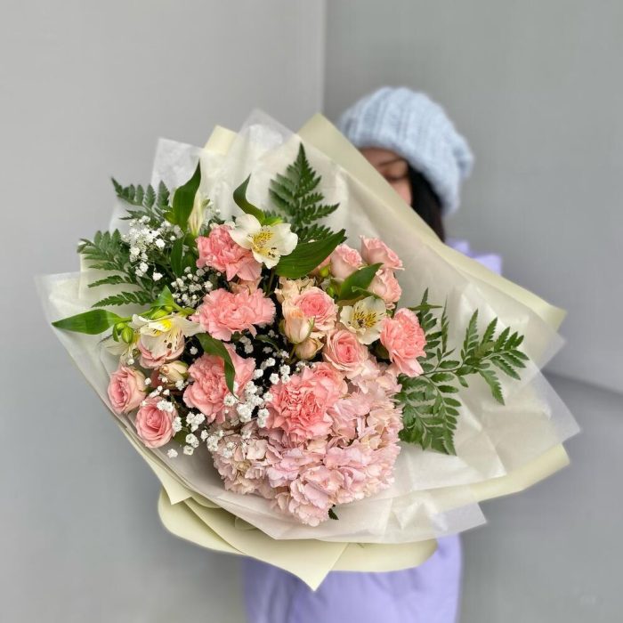 Альстромерия – 2 шт.Гипсофила – 2 шт.Гортензия – 1 шт.Папоротник – 4 шт.Роза кустовая – 3 шт.Лента атласная – 2 шт.Тишью – 2 шт.Диантус – 5 шт.Упаковка дизайнерская – 5 шт.