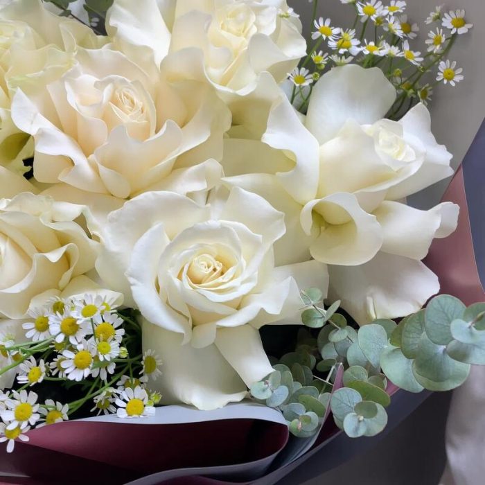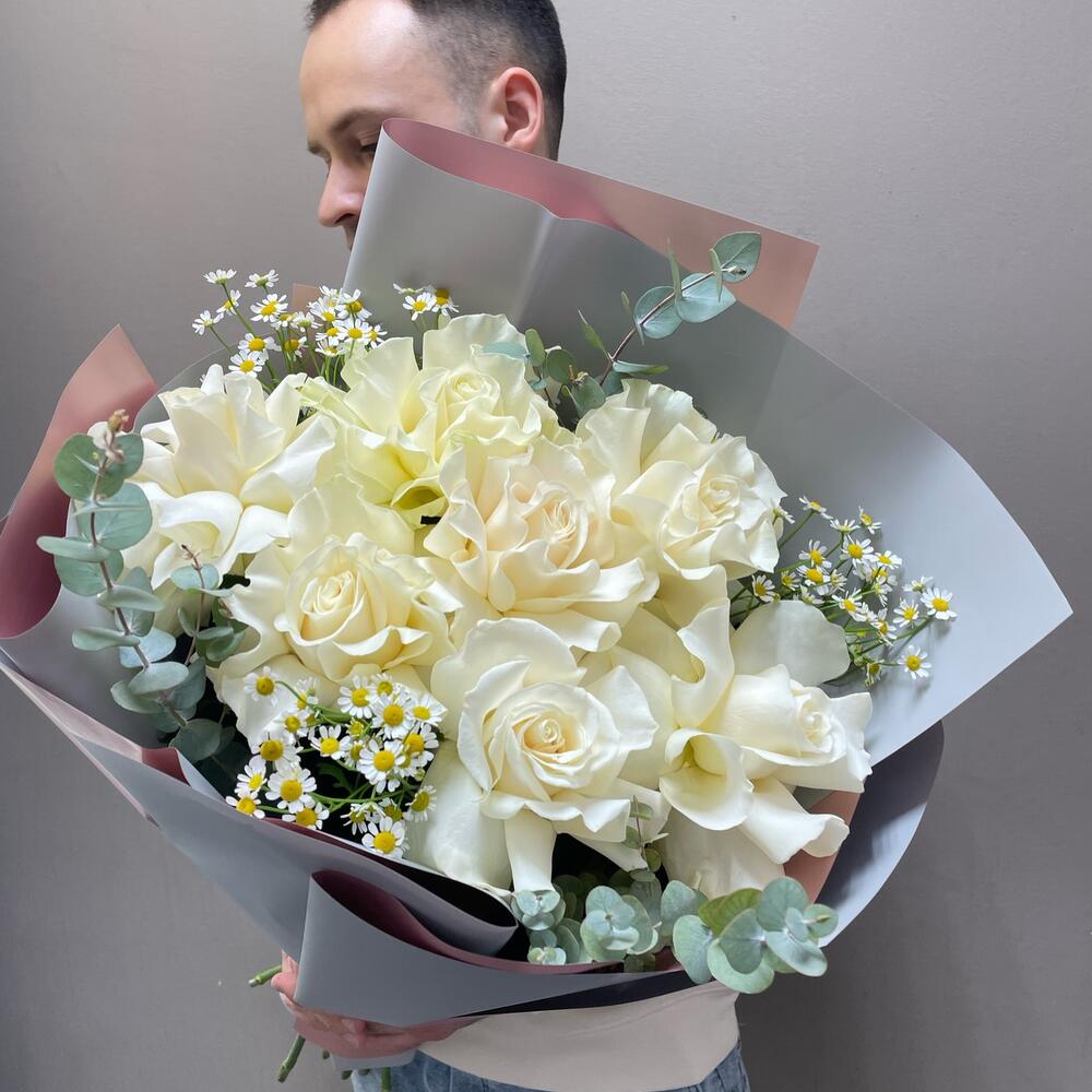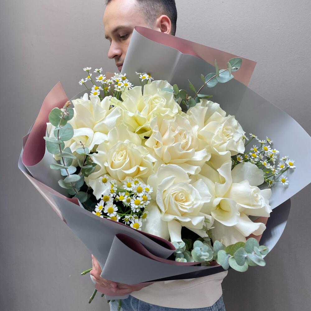 Эвкалипт – 2 шт.Лента атласная – 1 шт.Матрикария – 3 шт.Упаковка дизайнерская – 1 шт.Французская роза – 7 шт.