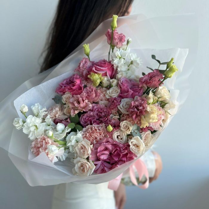 Маттиола – 3 шт.Эвкалипт – 1 шт.Кустовая роза – 7 шт.Гвоздика – 7 шт.Эустома – 2 шт.Пионовидная роза – 5 шт.