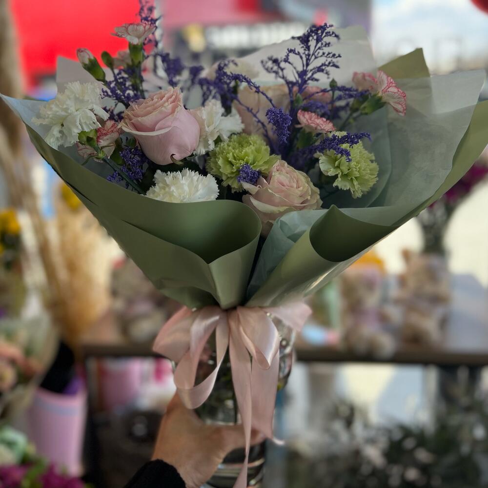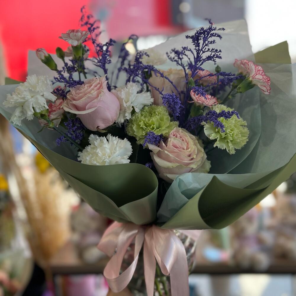 Гвоздики, Кустовые розы, Пионовидные розы, Розы