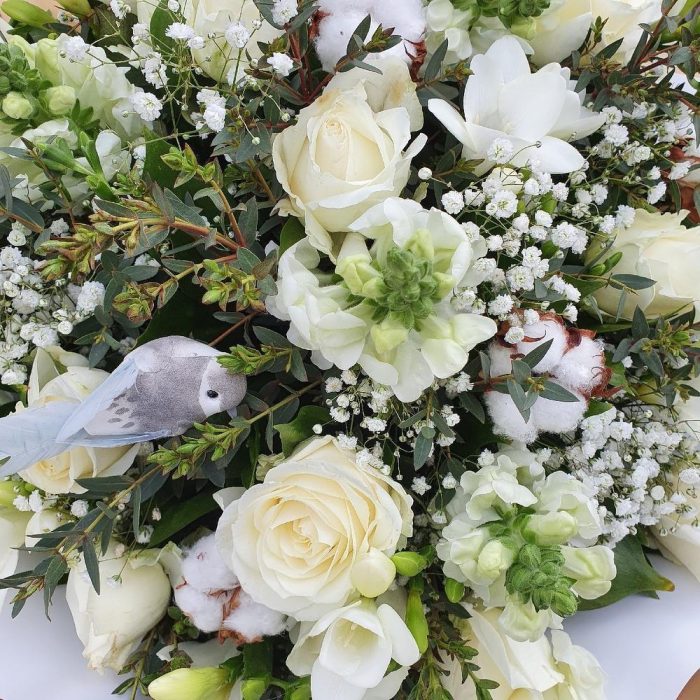 Гипсофила – 4 шт.Эвкалипт – 5 шт.Зелень – 25 шт.Роза белая – 19 шт.Фрезия белая – 10 шт.Упаковка дизайнерская – 5 шт.Львиный зев – 10 шт.Птичка декоративная – 1 шт.Хлопок натуральный – 5 шт.