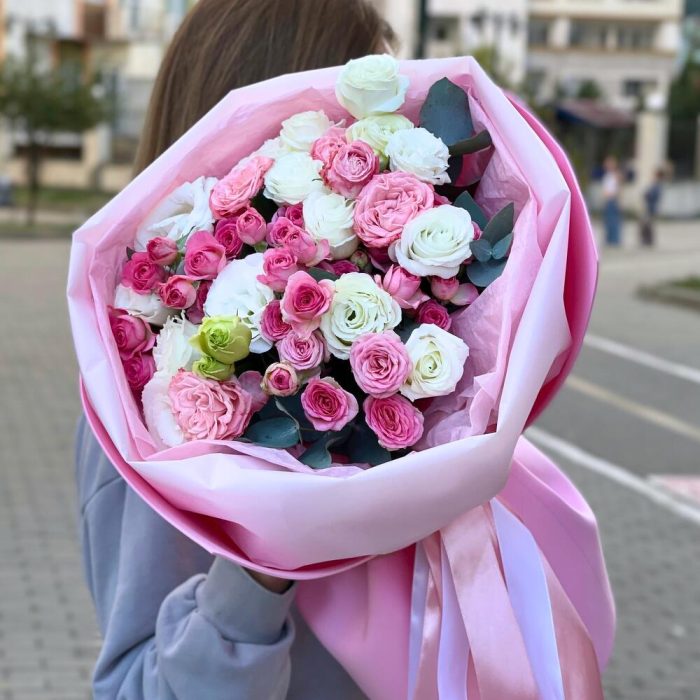 Букет включает в себя разнообразие цветов, что делает его ярким и разноцветным. Может включать разные цветы, в зависимости от сезона и предпочтений.