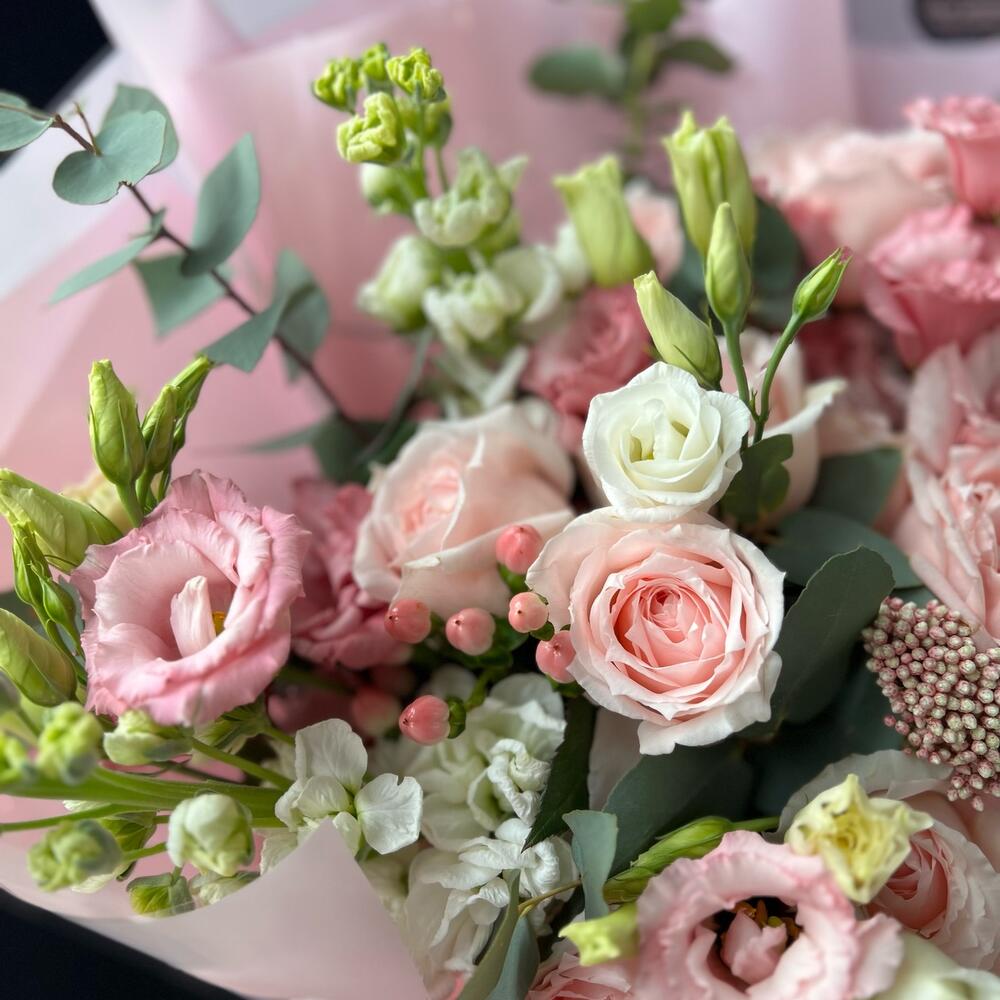Садовая роза – 9 шт.Лизиантус – 3 шт.Маттиола – 2 шт.Гиперикум – 1 шт.Озотамнус – 1 шт.Эвкалипт – 2 шт.декоративная упаковка – 1 шт.Атласная лента – 1 шт.