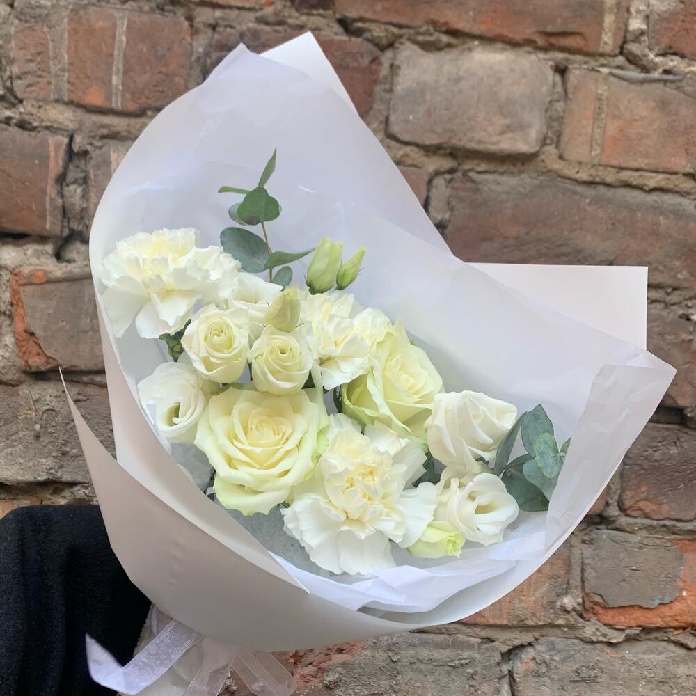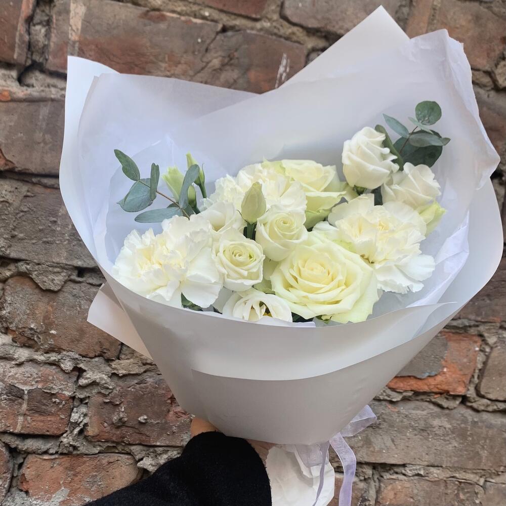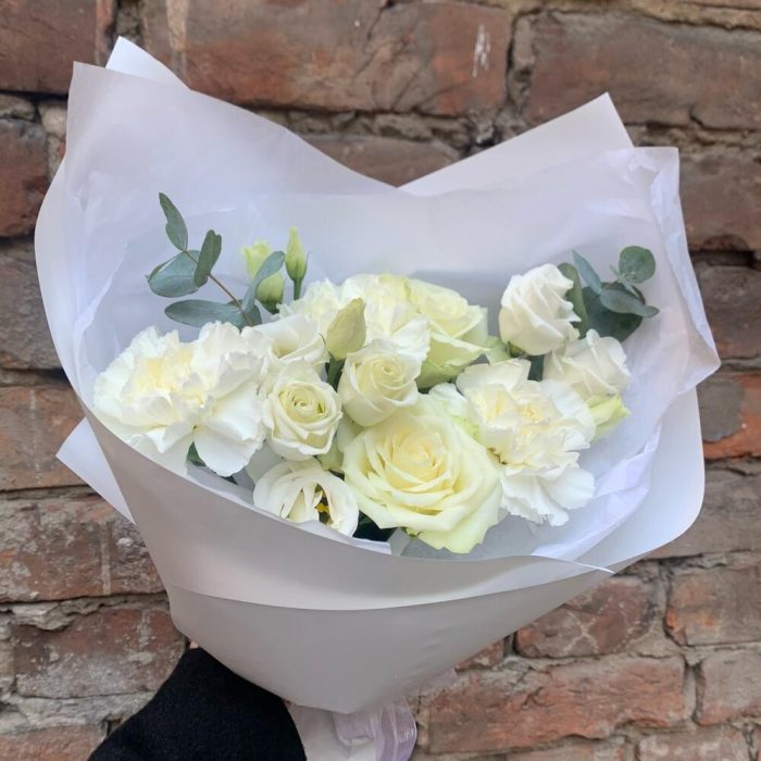 Белоснежный букет с гвоздикой и розой