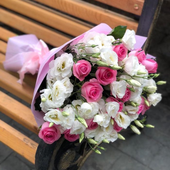 Роза розовая – 15 шт. эустома белая – 10 шт. Упаковка пленка матовая – 1 шт.