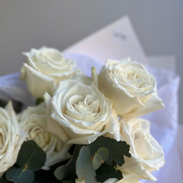 Белый моно букет из 11 роз и эвкалипта