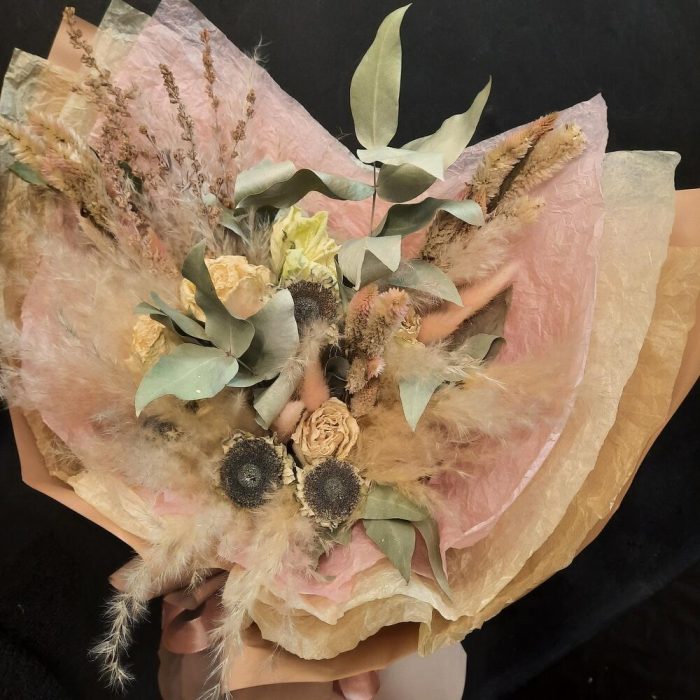 Целозия – 3 шт.Эвкалипт – 3 шт.Роза – 3 шт.Подсолнух – 4 шт.Лагурус – 7 шт.Дизайнерская упаковка – 1 шт.кортадерия – 1 шт.