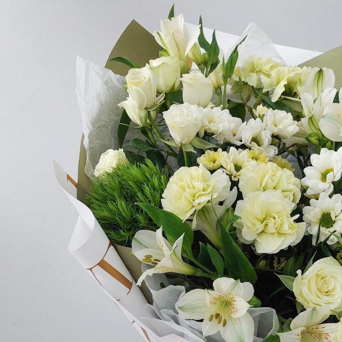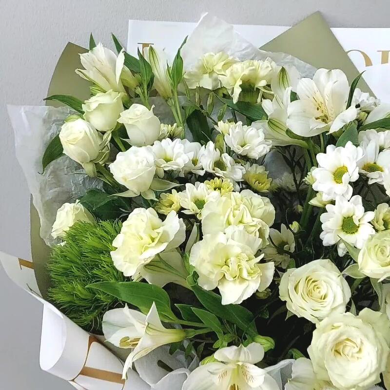 Зелень – 3 шт.Лента атласная – 2 шт.Тишью – 2 шт.Роза кустовая белая – 3 шт.Сантини – 3 шт.Упаковка дизайнерская – 2 шт.Открыточка с вашими пожеланиями – 1 шт.эустома белая – 2 шт.Гвоздика green trick – 3 шт.гвоздика белая сортовая – 3 шт.транспортировочная упаковка – 1 шт.