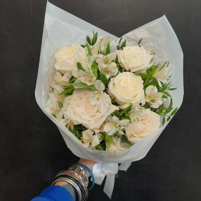 Букет из белых роз и белой алтстромерии в дизайнерской упаковке