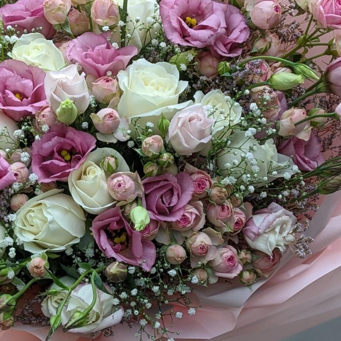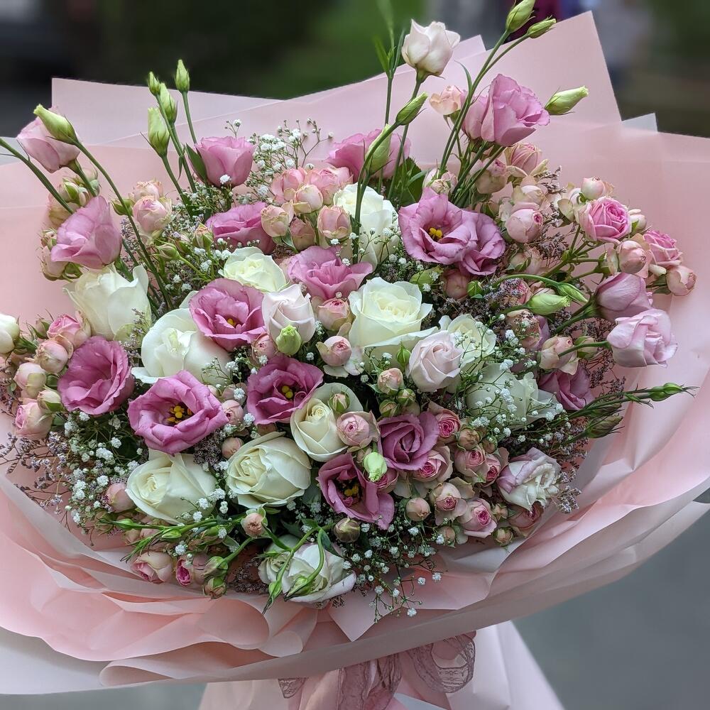Гвоздики, Лизиантусы, Розы, Тюльпаны
