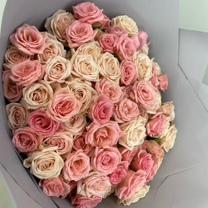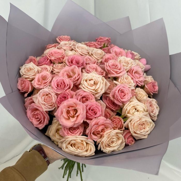 кустовая роза микс – 31 шт.Упаковка – 3 шт.Атласная лента – 1 шт.