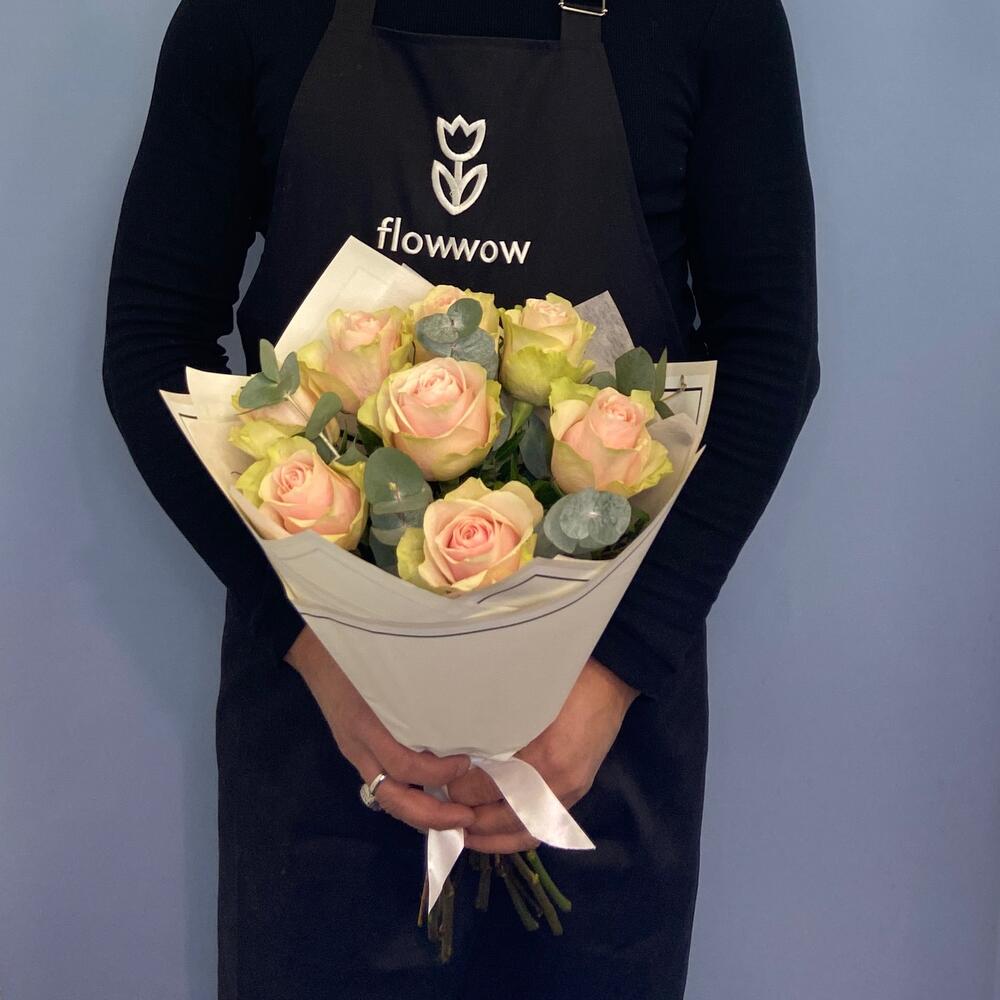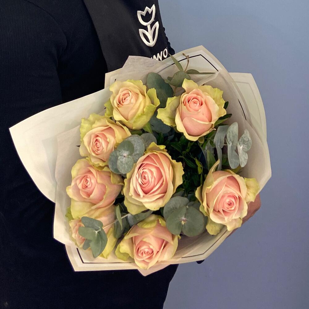 роза розовая фрутетто – 9 шт.Эвкалипт – 3 шт.Упаковка дизайнерская – 1 шт.Лента атласная – 1 шт.