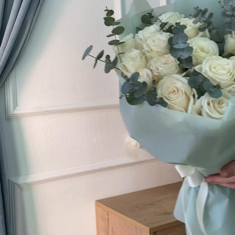 роза белая плайя бланка – 15 шт.эвкалипт 100 – 4 шт.Пленка дизайнерская – 4 шт.