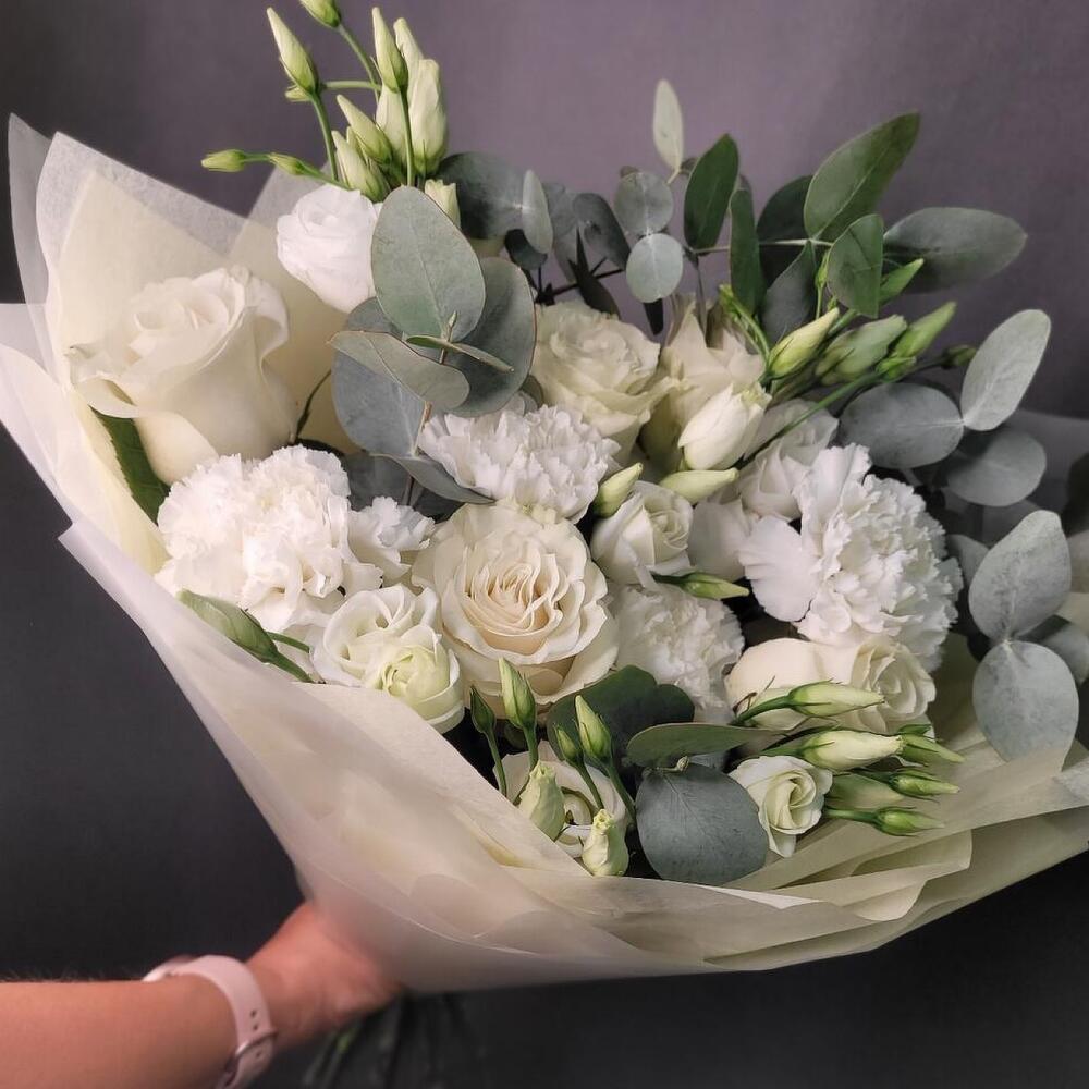 Роза Эквадор белая – 5 шт.Лизиантус – 3 шт.Диантус – 5 шт.Эвкалипт – 2 шт.Упаковка дизайнерская – 2 шт.